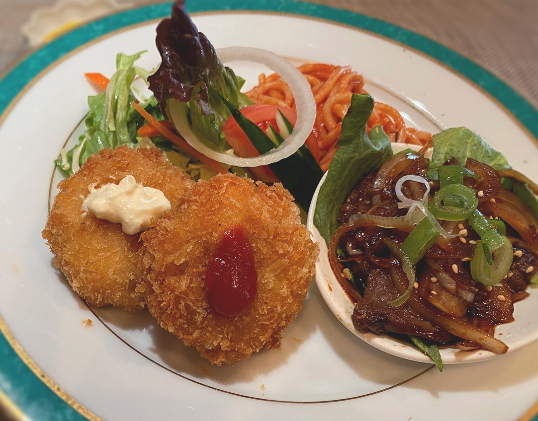 カニクリームコロッケ&牛肉の生姜焼き(ライス・サラダ付き)