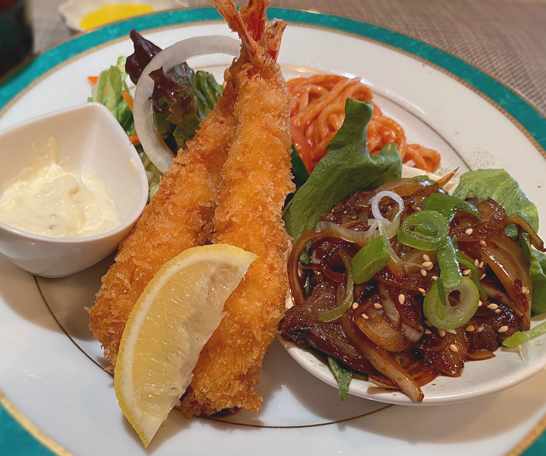 大エビフライ&牛肉の生姜焼き(ライス・サラダ付き)